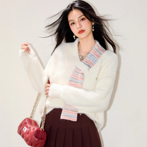R5610气质2025休闲围脖拼接设计感针织衫男女V领休闲百搭情侣毛衣