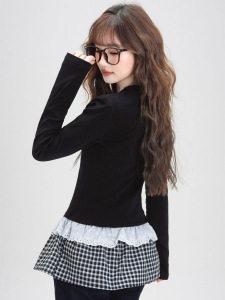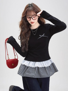 格子拼接蕾丝长袖2025早秋新款假两件内搭叠穿设计感小众打底上衣