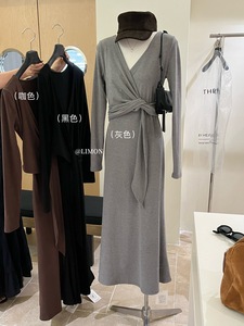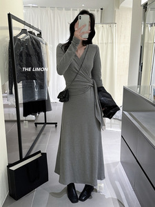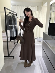 【高品质订货】高级感气质V领褶皱修身显瘦微磨毛弹力长裙连衣裙