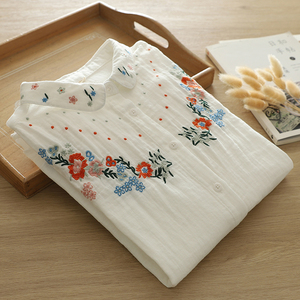 2025秋装文艺气质舒适双层棉纱清新花朵刺绣小圆领衬衣女长袖纯棉