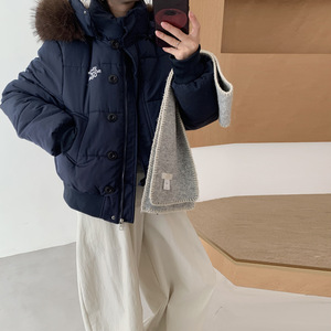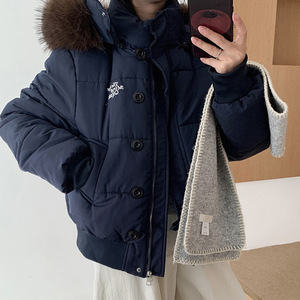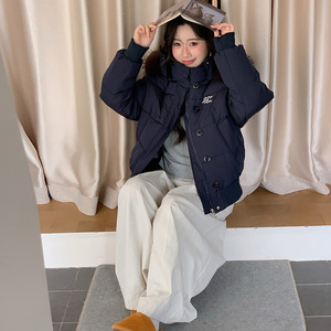 E5071藏青色连帽冬季新款女短款棉服宽松美式学院风棉衣外套潮流