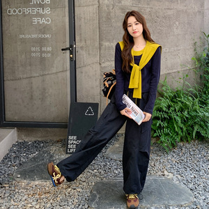 实拍减龄撞色披肩T恤阔腿裤套装2025秋甜酷短上衣工装裤两件套