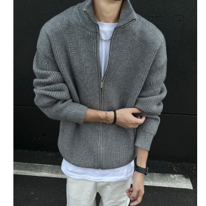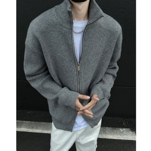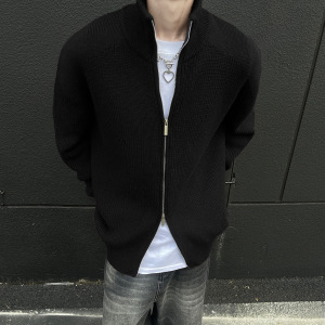 慵懒风毛衣男秋冬设计感双拉链开衫立领外套男宽松休闲针织衫开衫