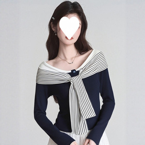 工厂直销批发 藏蓝色披肩打底衫女秋季学院风巨好看轻熟长袖上衣