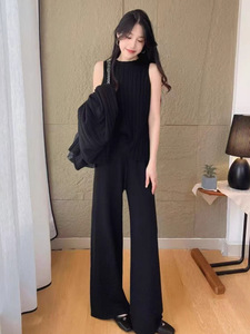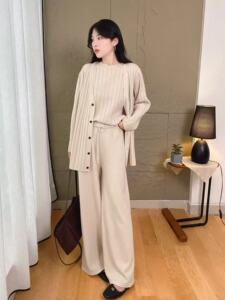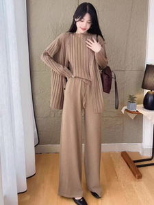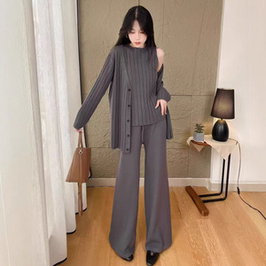 竖条纹针织套装女装秋冬新款跨境慵懒风开衫外套背心阔腿裤三件套
