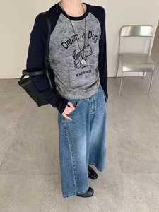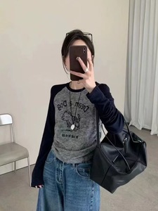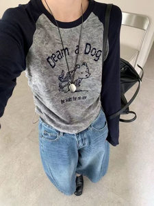 美式复古甜辣妹撞色插肩袖狗狗字母植绒晕染打底衫t恤女秋冬上衣