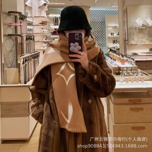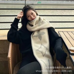 秋冬保暖浅灰色羊毛围巾女经典老花双面高级感长披肩羊绒加厚围脖