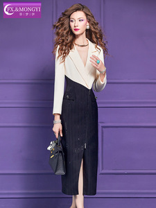 菲梦伊亮片撞色西装连衣裙女长袖秋季高级感气质通勤职业开叉裙子