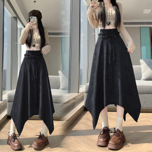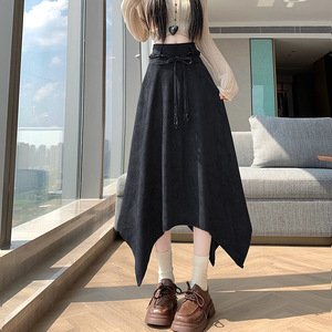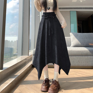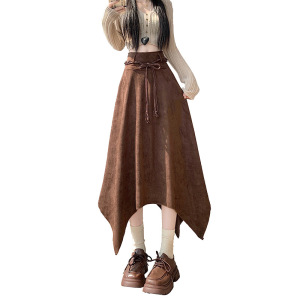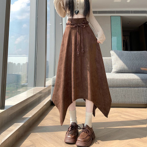 复古麂皮绒高腰抽绳半身裙女秋季新款老钱风不规则显瘦A字中长裙