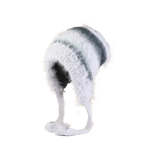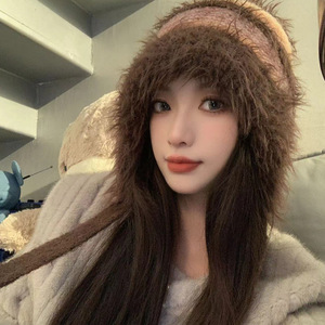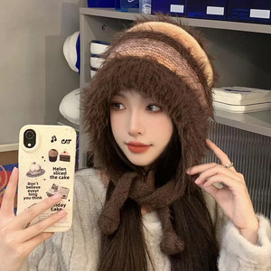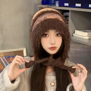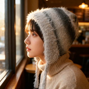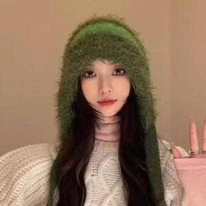 渐变色毛绒针织帽女秋冬季保暖护耳套头帽可当包包可爱彩色毛线帽