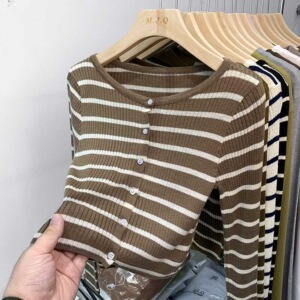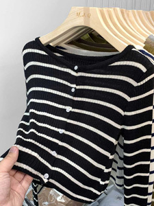 短款针织开衫女毛衣2025新款条纹上衣圆领长袖针织外搭春秋季外套
