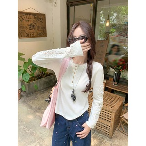 韩系白色镂空蕾丝长袖t恤女早秋季修身内搭打底衫外穿上衣