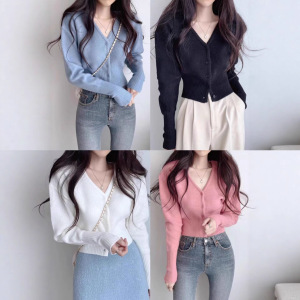 春秋氛围感短款开衫小众别致V领毛衣外套修身显瘦收腰针织上衣女