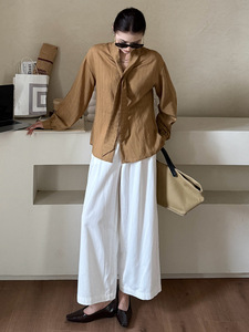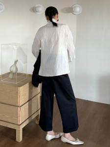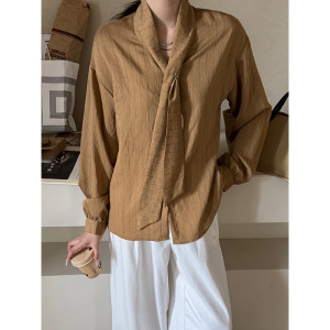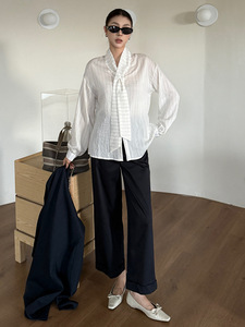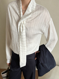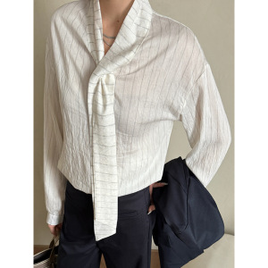云长 不规则领带麻衬衫女秋长袖高智感条纹通勤女式白衬衣 K0129