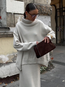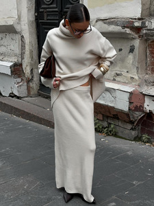 跨境杏色高领宽松针织套装毛衣配长裙软糯亲肤秋冬保暖慵懒高级感