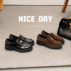 牛皮版~葡萄妈金扣小皮鞋女真皮粗跟厚底复古英伦风休闲乐福鞋