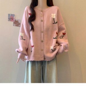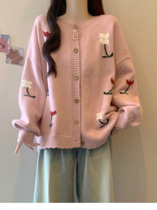 秋冬大码女装新款韩版刺绣花朵别致宽松慵懒风漂亮毛衣外套女开衫