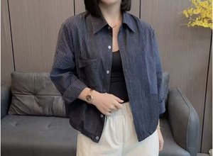 蓝色条纹拼接牛仔衬衫女2025年新款设计感长袖休闲外套宽松上衣潮