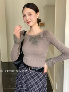 秀熙熙2025秋季新款白标优雅斜肩仿羊毛针织衫长袖上衣毛衣89616