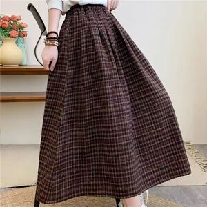 加厚毛呢松紧高腰格子半身裙中长款秋冬新款复古文艺A字长裙女