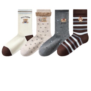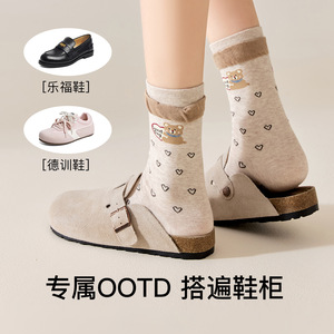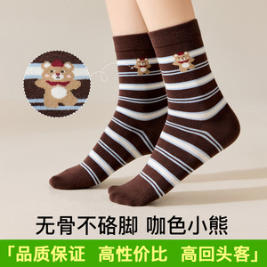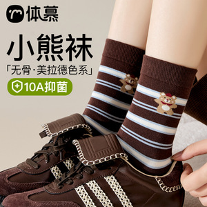 小熊刺绣袜子女新疆棉长筒袜无骨抗起球秋冬咖色棉袜学院风中筒袜