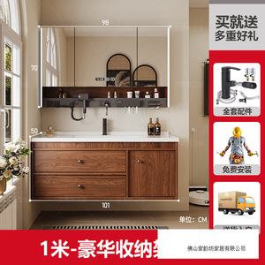 1米 胡桃木色/豪华收纳架镜柜 陶瓷一体盆/包入户+安装