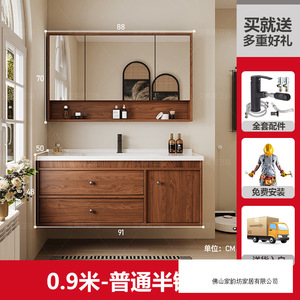 0.9米 胡桃木色/普通半镜柜 陶瓷一体盆/包入户+安装