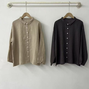 2025秋季新品复古纯色亚麻衬衫翻领衬衣气质开衫上衣女