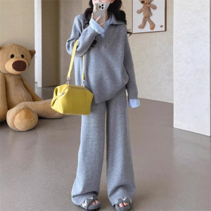 时尚慵懒风针织套装女秋冬季新款衬衫拼接假两件毛衣阔腿裤两件套