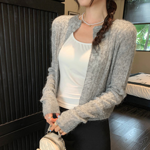 欧货高级感灰色绞花长袖针织开衫女秋2025新款外搭短款小香风上衣