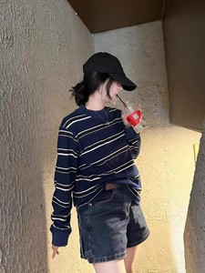 小个子藏蓝色条纹圆领无帽卫衣女早秋季美式慵懒chic宽松短款上衣