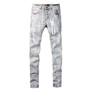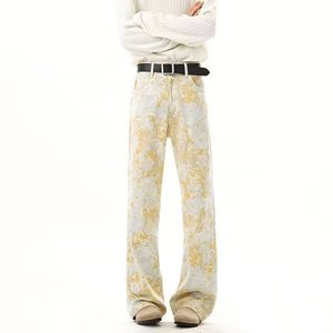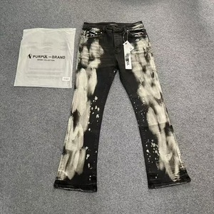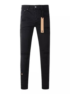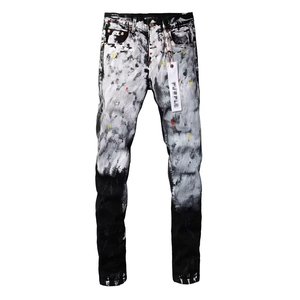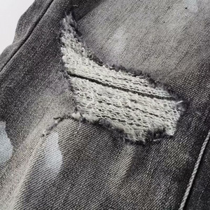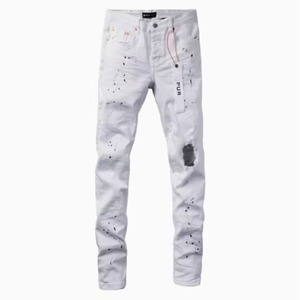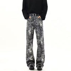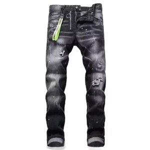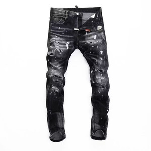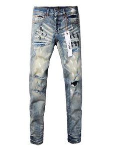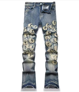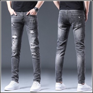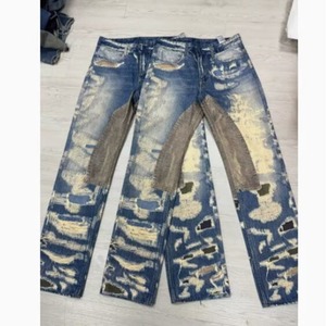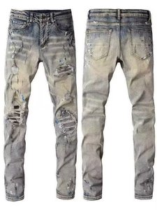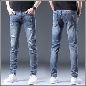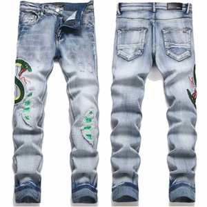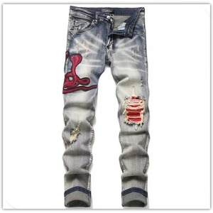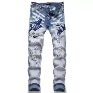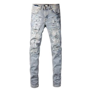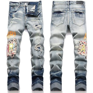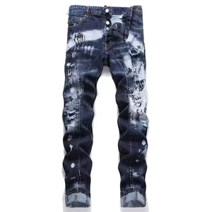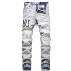 高版AM外贸风格朋克复古蓝破洞修身弹力印花印染小脚男式牛仔裤潮