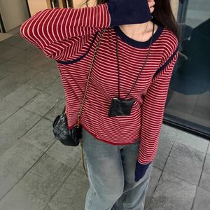 韩系气质丝光羊毛 拼接撞色 显瘦长袖条纹秋季百搭套头高智淡人女