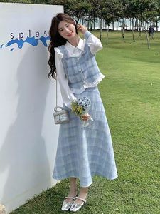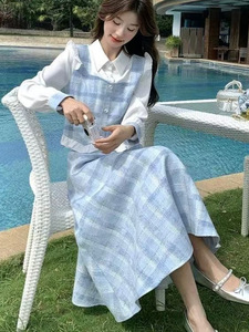 蓝色气质千金风两件套女2025春新款格纹拼接假两件上衣半身裙套装