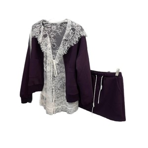 2025年秋季新款韩系穿搭纯色圆领外套+蕾丝开衫+高腰半身裙三件套