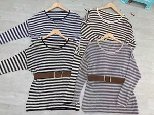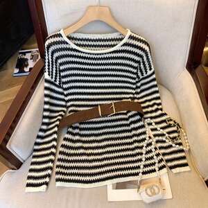 韩系慵懒风腰带套头条纹毛衣女装25年秋冬大码宽松针织衫显瘦上衣