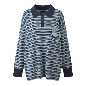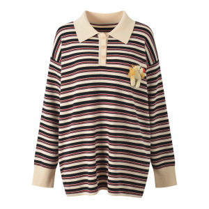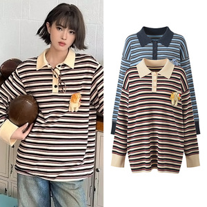 2025秋季新款韩系学院风POLO领条纹钩织小马宽松针织衫上衣