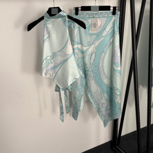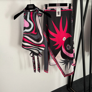 2025夏季南油新款套装拼色印花系带露背挂脖背心衣+高腰开叉半裙