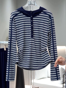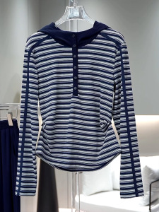 大码韩系半开领条纹连帽长袖T恤女早秋新款宽松休闲百搭别致上衣