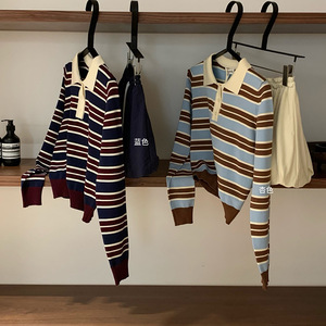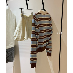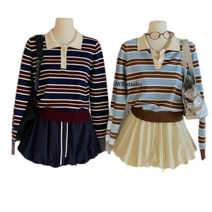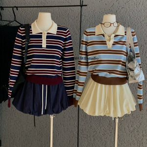 WGWE7106复古撞色条纹polo针织衫+百搭蓬蓬半身裙套装