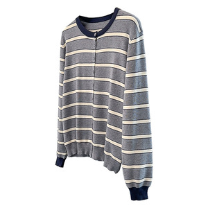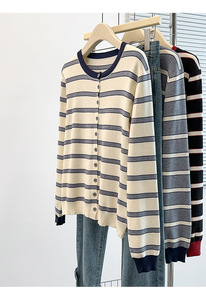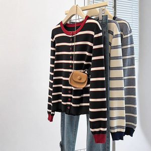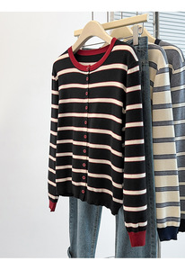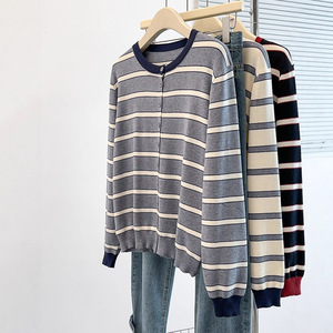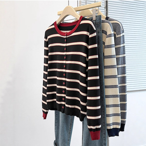大码休闲减龄撞色条纹软糯针织开衫女2025秋季新款设计感圆领上衣