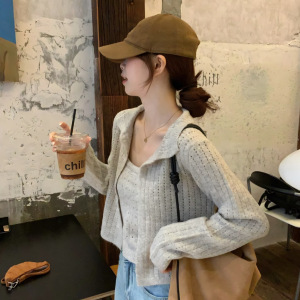 2025超火多巴胺穿搭一整套黄色镂空针织开衫外套吊带上衣两件套装