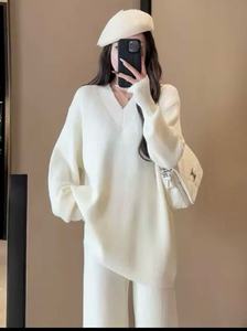 韩版慵懒风2025年冬款V领针织衫套头毛衣+阔腿裤休闲套装时尚休闲