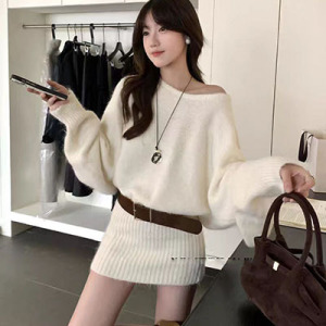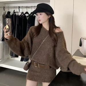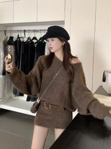 韩系氛围感早秋穿搭斜肩设计感长袖针织衫连衣裙女秋装慵懒风裙子