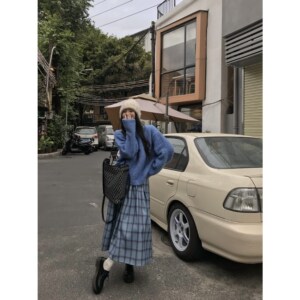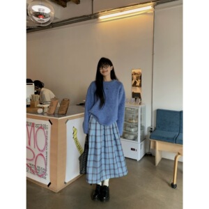 韩系百搭甜美纯色圆领长袖毛针织衫春秋新款格纹毛呢半身裙套装女
