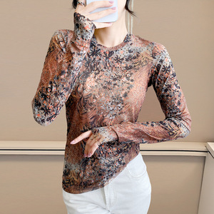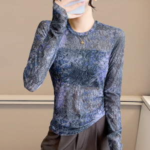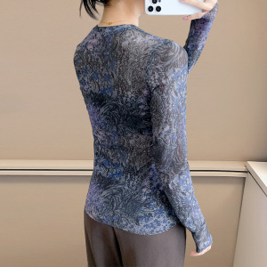 2025年秋冬新款网纱印花圆领长袖t恤时尚修身显瘦打底衫小众女装