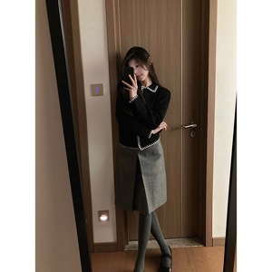实拍秋季新款明线娃娃领针织开衫女两面穿灰色百褶裙中裙时尚套装