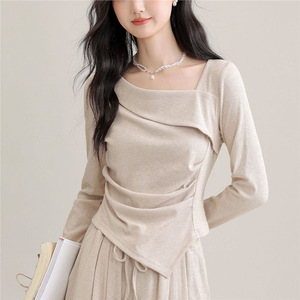 2025秋新款叠穿设计感修身打底衫女斜领收腰T恤内搭显瘦上衣套装