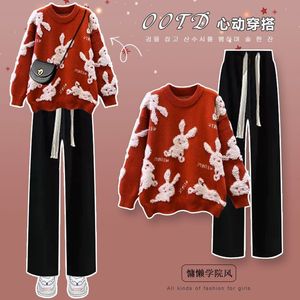 红色毛衣+黑色阔腿裤