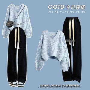浅蓝毛衣+黑色阔腿裤